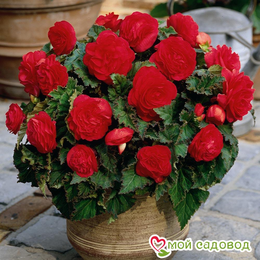 Бегония махровая Скарлет – клубневое растение высотой 25-35см. Красивы ее зеленые сердцеобразные листья с неровно зубчатыми краями, прекрасны и махровые ярко алые цветки, похожие на розочки, диаметром до 11см. Бегония хороша для озеленения помещений, лоджий, балконов и для клумб, цветников и рабаток. В районах с мягким климатом разводят в открытом грунте, в более холодных районах высаживают на балконах или в саду только на летний период. Бегония любит рыхлый питательный грунт со слабокислой реакцией. Оптимальная схема посадки 20х30 см.Сделайте дренаж. Поливайте регулярно и умеренно. Раз в месяц подкармливайте минеральным удобрением. В период покоя обеспечьте прохладную зимовку. Чтобы растения зацвели к началу лета, посев на рассаду делают в январе-марте. Заделка не требуется. Просто равномерно распределите по рыхлому торфяному субстрату.